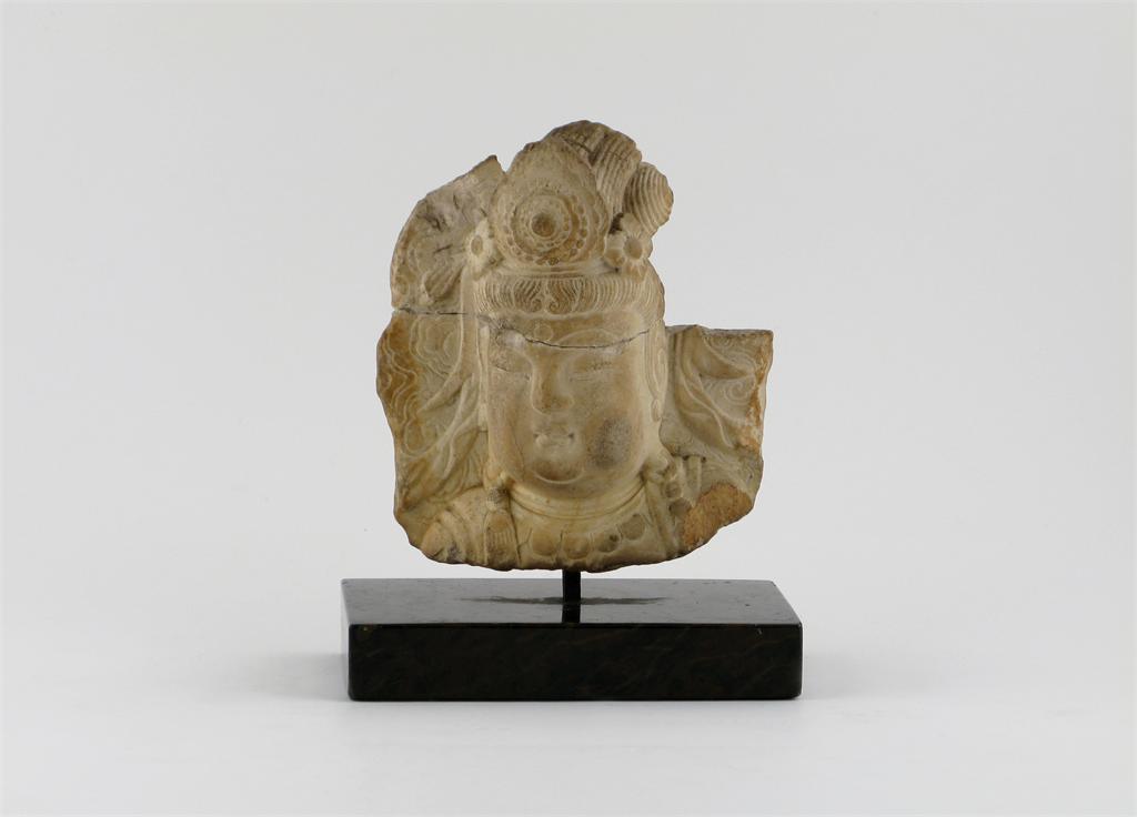 A Chinese marble carving of the head of Guanyin, turned slightly to dexter, old damage, 16cm. Provenance: From the estate of the late Gordon Davies.