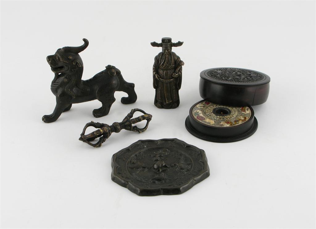 A Chinese astrologer's compass, with a reticulated panel to the cover, a bronze mirror, a vajra, a Confucian figure and a bronze mythical beast, 18th century and later, 12cm. (6)