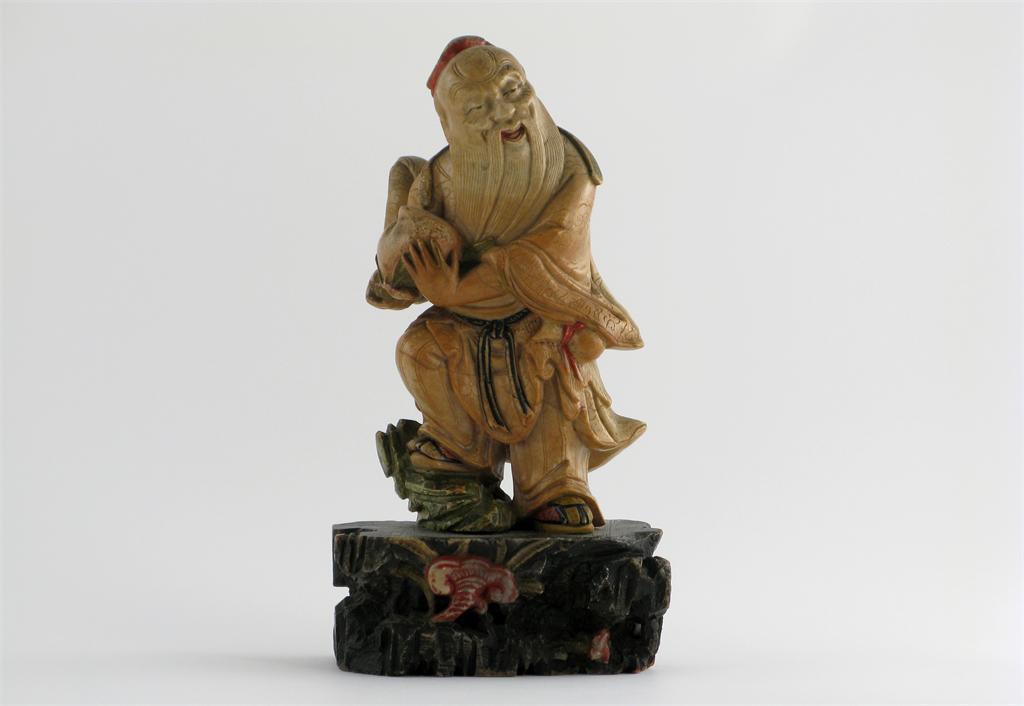 A Chinese soapstone carving of Shoulao, standing, holding the peach of immortality, 19th century, 21cm.