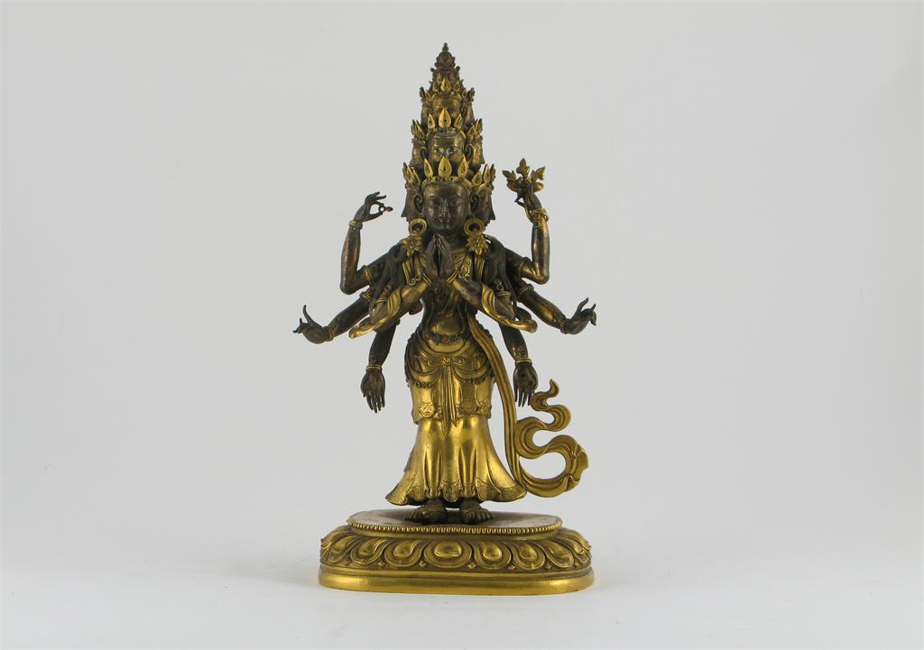 **A Chinese gilt bronze standing figure of Avalokitesvara, the deity with eight arms and ten heads, inlaid with coral and turquoise, 18th/19th century, one ribbon missing, 25.5cm.