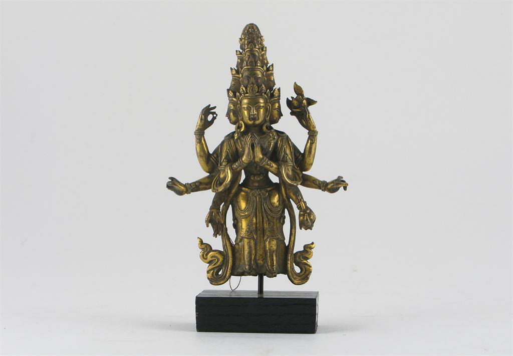 **A Chinese gilt bronze figure of Avalokitesvara, holding various attributes in his eight arms, 18th century, damages, 15cm.