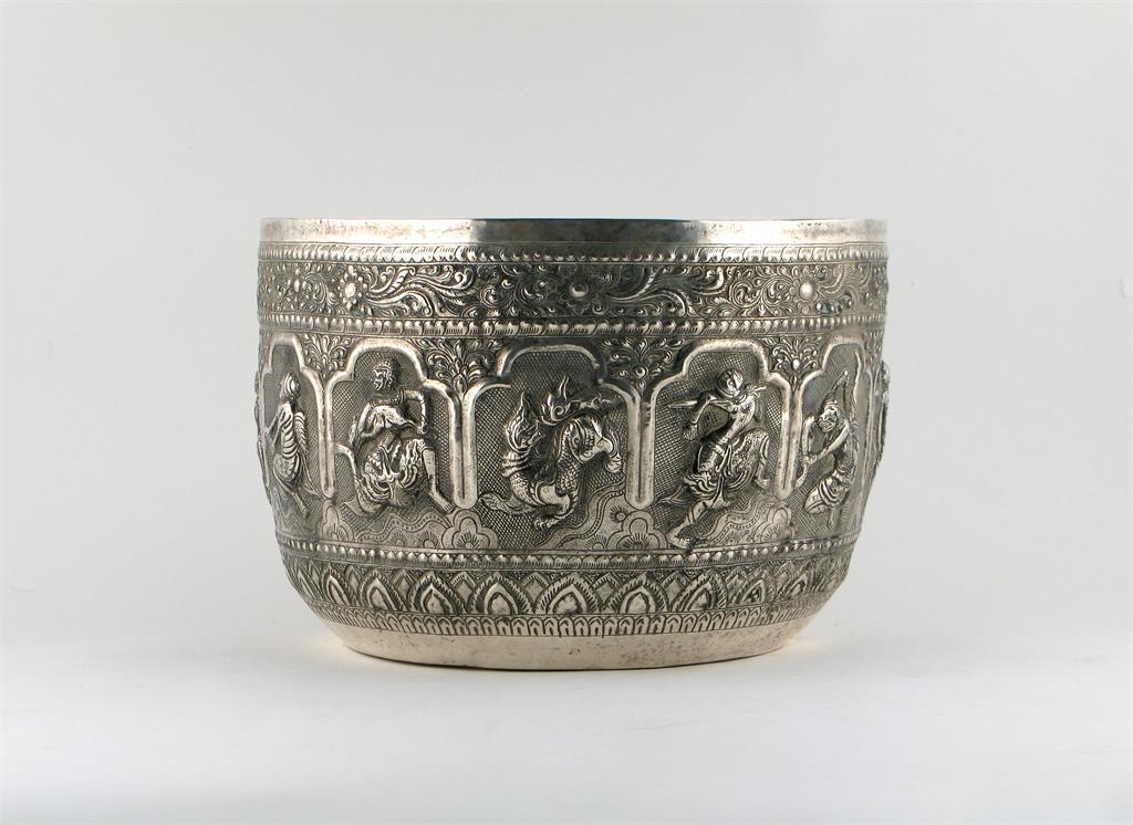A South East Asian silver-coloured metal bowl, embossed with twelve panels of figures and animals beneath floral borders, the base inscribed 'Charles Napier Stewart to George H Lewis 1876', 26.5cm.