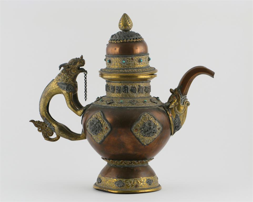 A Tibetan copper ewer and cover, the spout emerging from the mouth of a ferocious makara, the handle as another, with a scaly elongated body, applied with brass reliefs, the neck with characters and inset stones, 19th century, the connecting chain broken, the finial loose and cracked, 32cm.