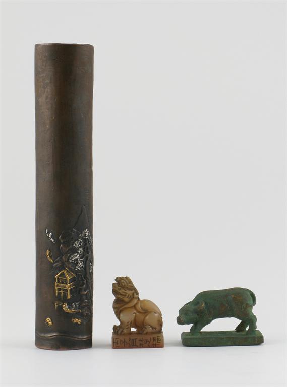 A Chinese bronze wrist rest, moulded with small figures and creatures amidst swirling waves, highlighted in gold and silver, a Chinese patinated bronze seal, carved as a buffalo and a Chinese agate seal, 20cm max. (3)