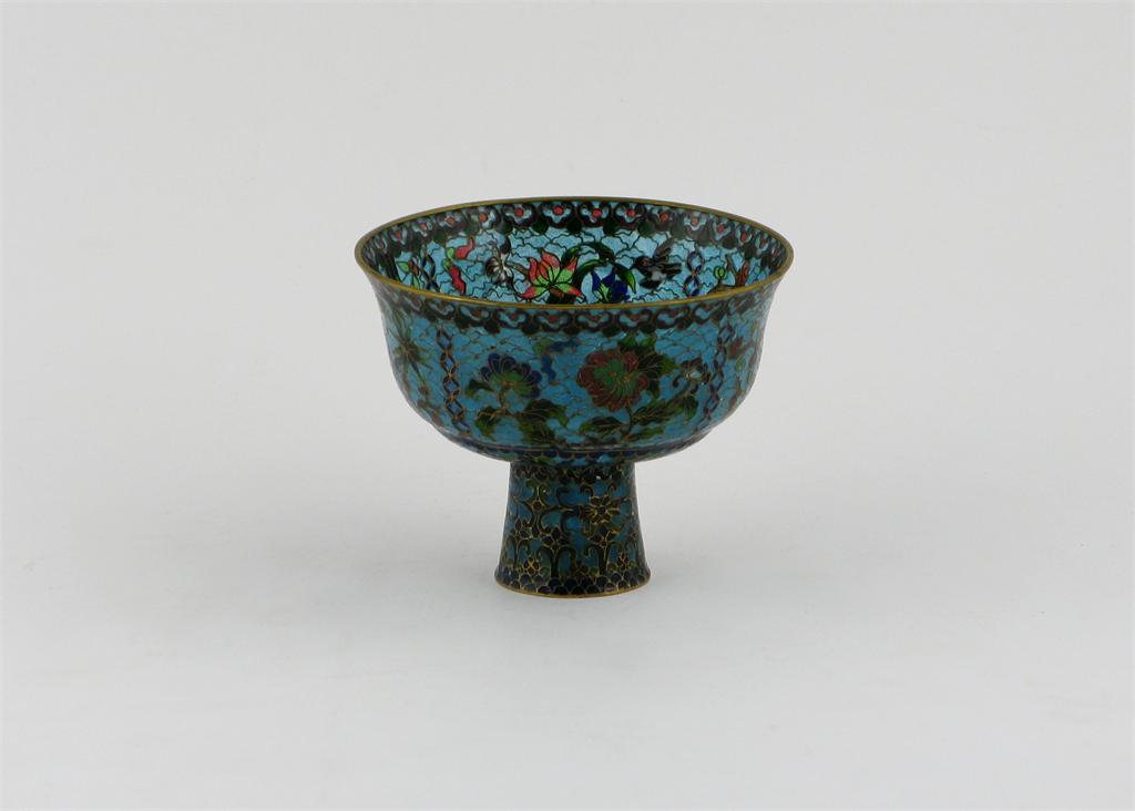 **A Chinese plique à jour stem cup, decorated with birds above peony, bamboo and prunus, 10cm.