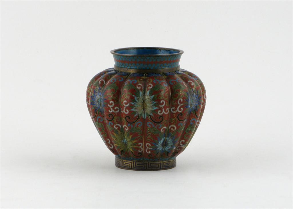 A small Chinese cloisonné ribbed ovoid vase, decorated with lotus flower heads and scrolling foliage on a coral ground, 18th/19th century, 10cm.