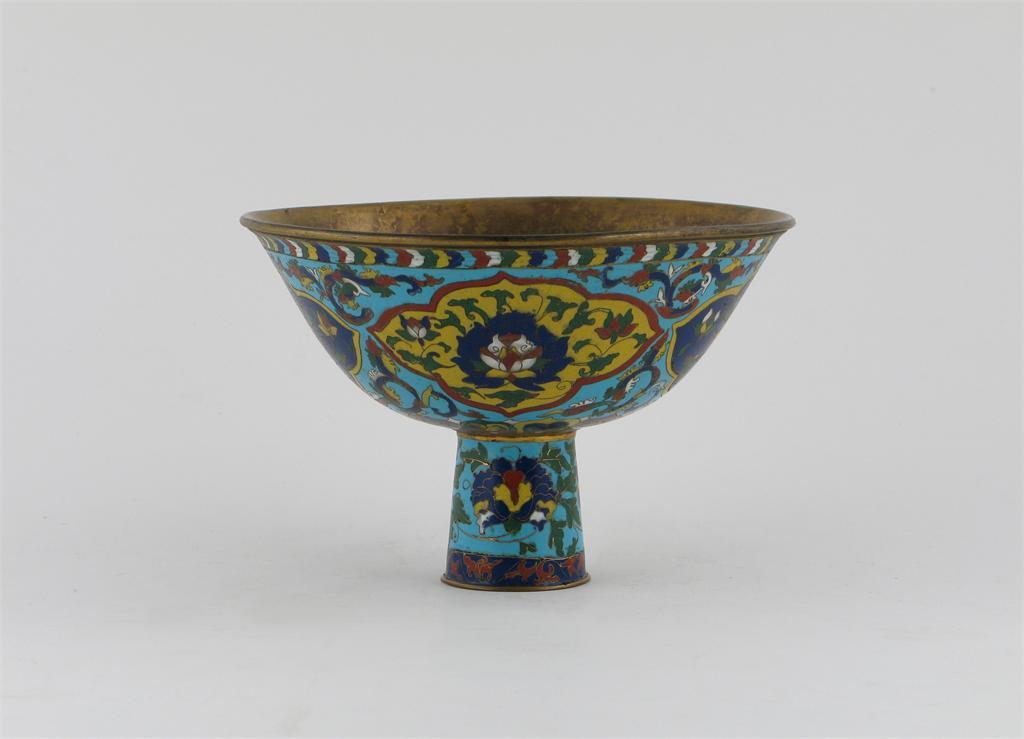 A Chinese cloisonné stem bowl, the exterior brightly decorated with panels containing lotus and peony on a turquoise ground, 19th/20th century, 17cm.