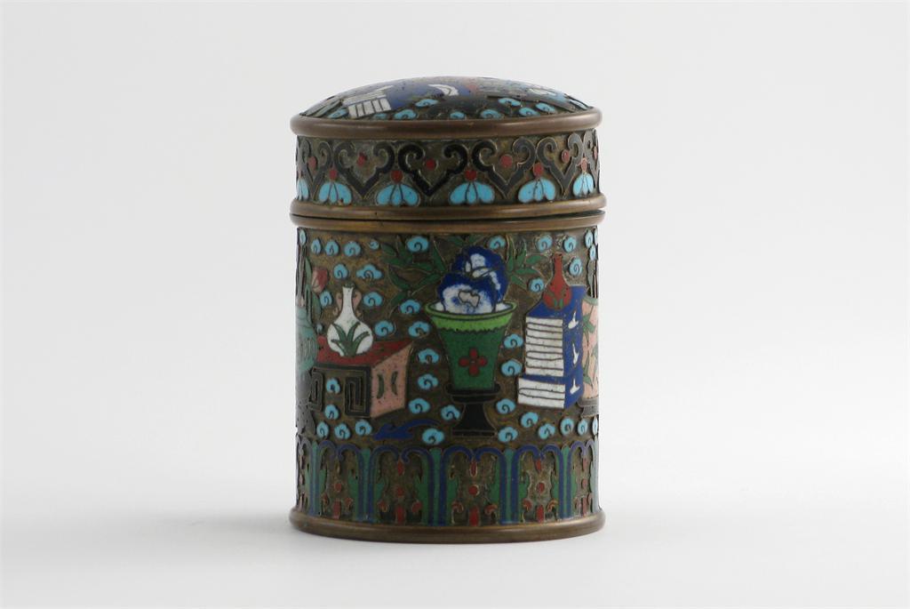 A Chinese cloisonné cylindrical box and cover, decorated with auspicious objects, c. 1900, 9.5cm. (2)