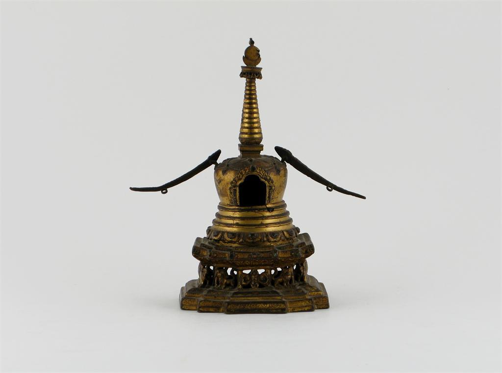 A Tibetan gilt bronze stupa, with a fourteen stepped finial and borders inset with jewelling, 17th/18th century, wears and losses, 20cm.