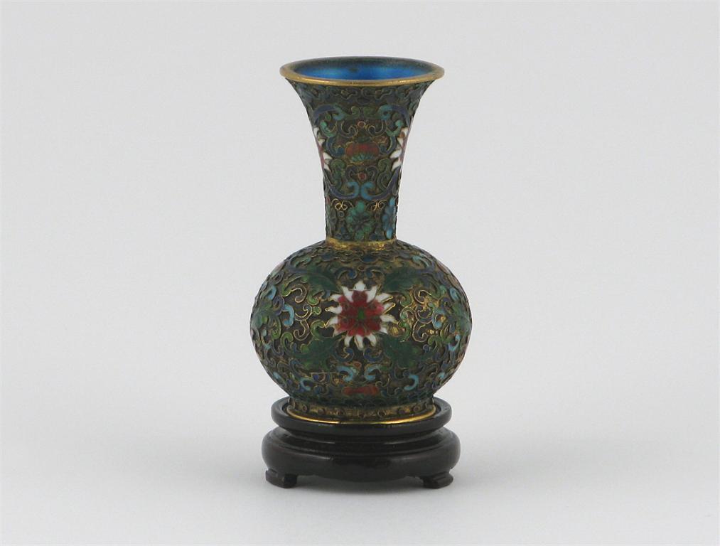 A small Chinese cloisonné vase, the body decorated with flowers and foliage on a gilt ground, c.1900, 8cm. Wood stand. (2)