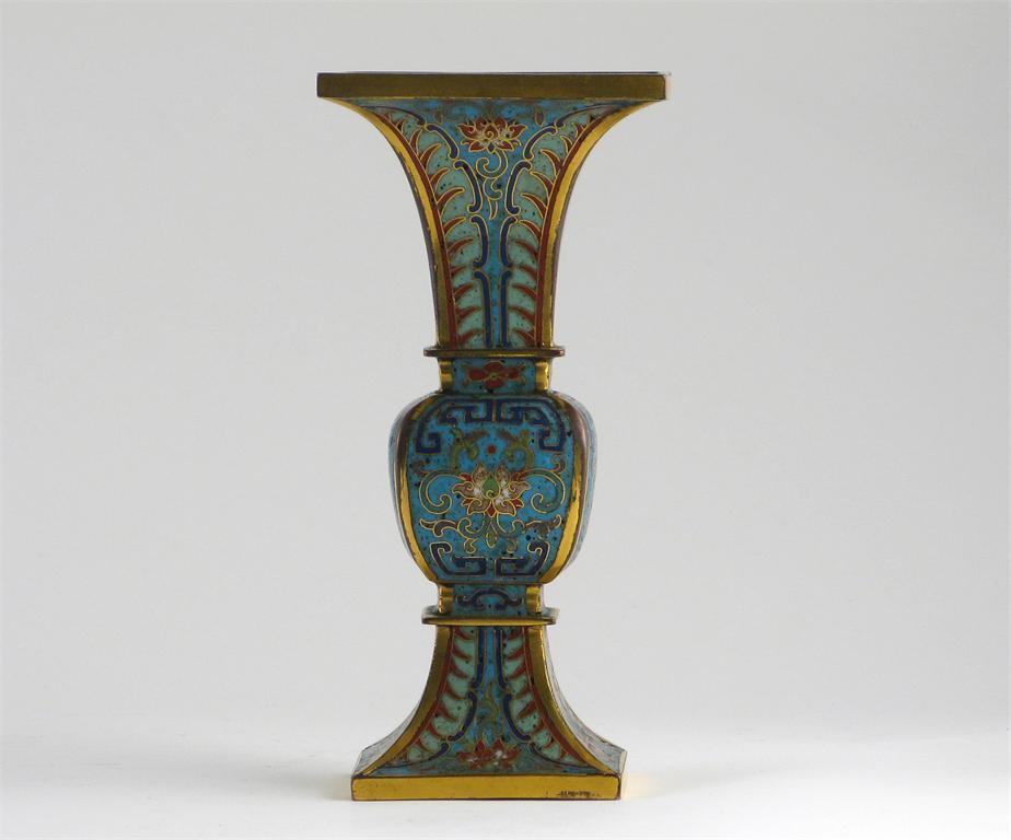 A fine Chinese cloisonné gu-shaped vase, decorated in bright polychrome enamels with geometric motifs and lotus scrolls, the foot incised with a dot motif, 18th century, some rubbing to the gilding, 17.2cm