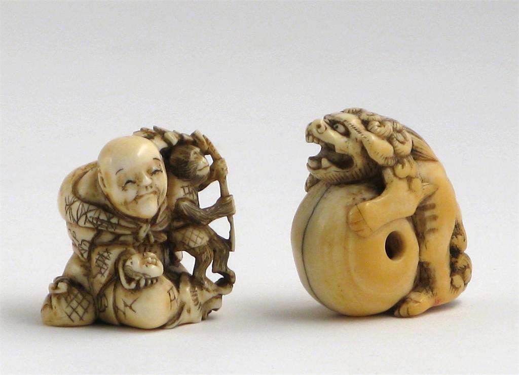 Two Japanese ivory netsukes, one carved as a lion dog crouching over a large ball, a loose ball rolls in its mouth, the other as a seated sorcerer holding a mask in his hand, a little monkey stands before him holding a branch, early 20th century, 3cm max. (2)