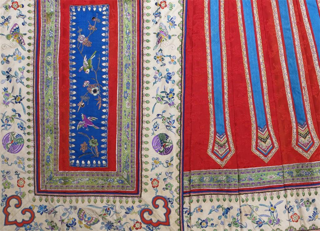 Two Chinese embroidered panels, decorated with butterflies, flowers and lappets on a red ground, formerly part of a skirt, c.1900. (2)