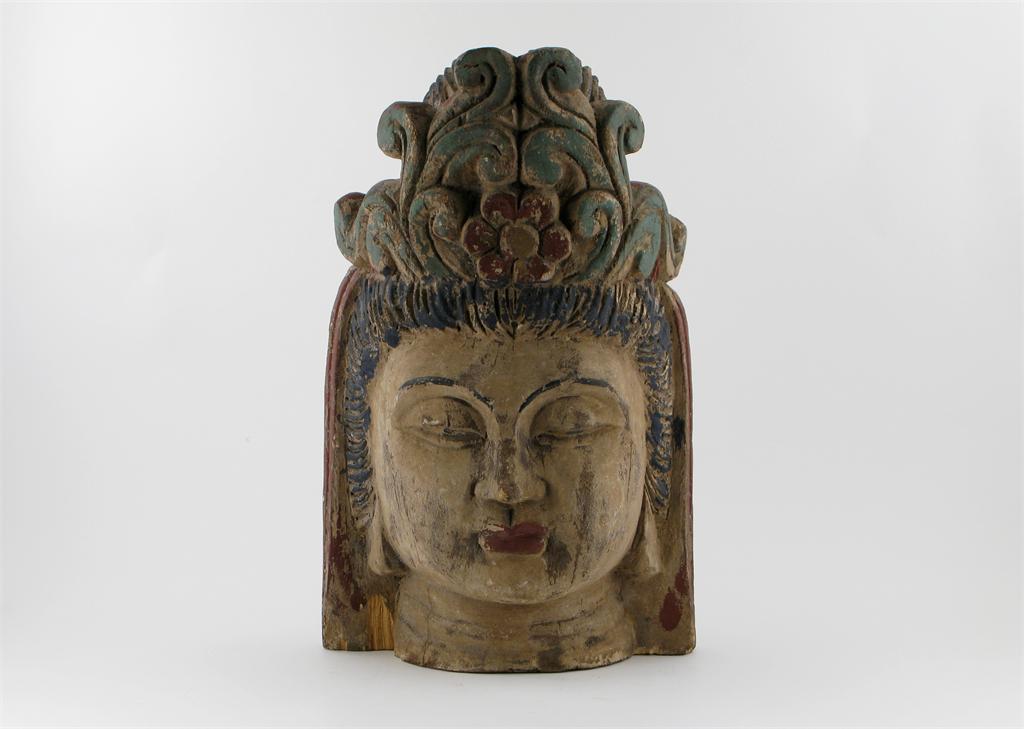 A Chinese carved wood head of Guanyin, details picked out in colour, 41cm.