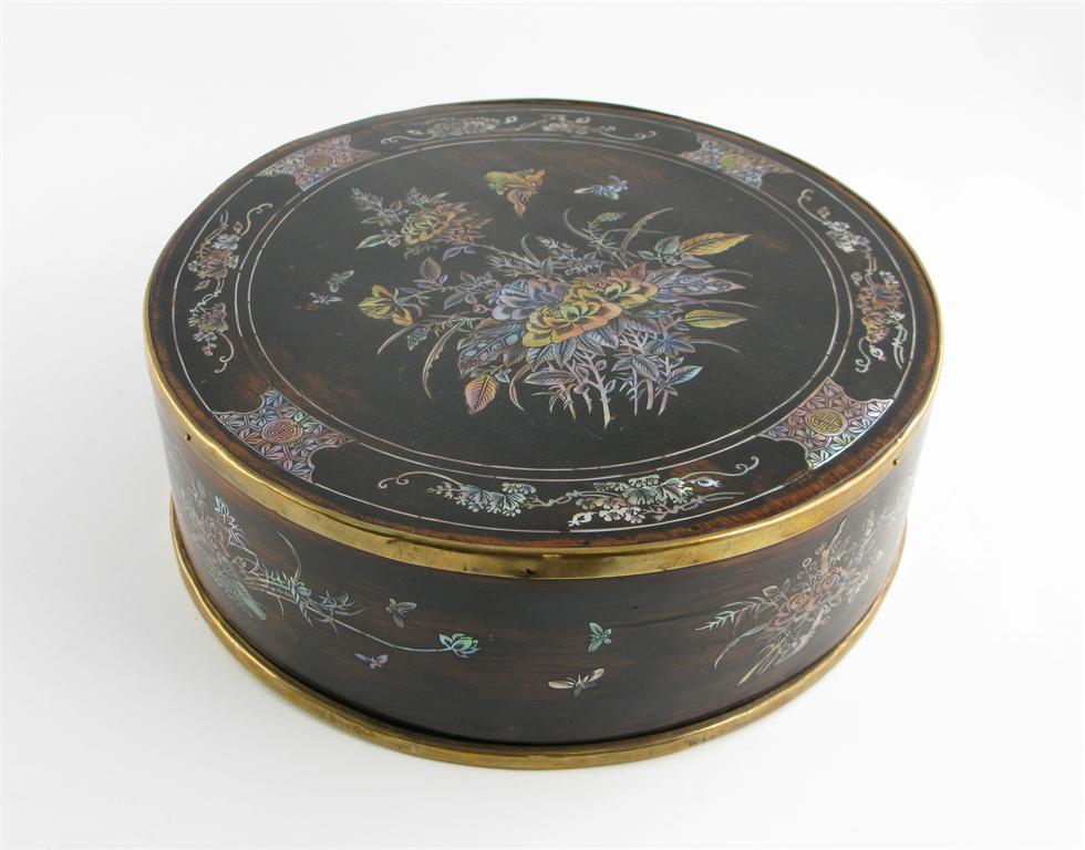 A Chinese hardwood circular games box and cover, bound in brass and inlaid with mother of pearl, the inner section with five compartments, mid 19th century, minor rubbing, split to the wooden base, 24.5cm. (3)