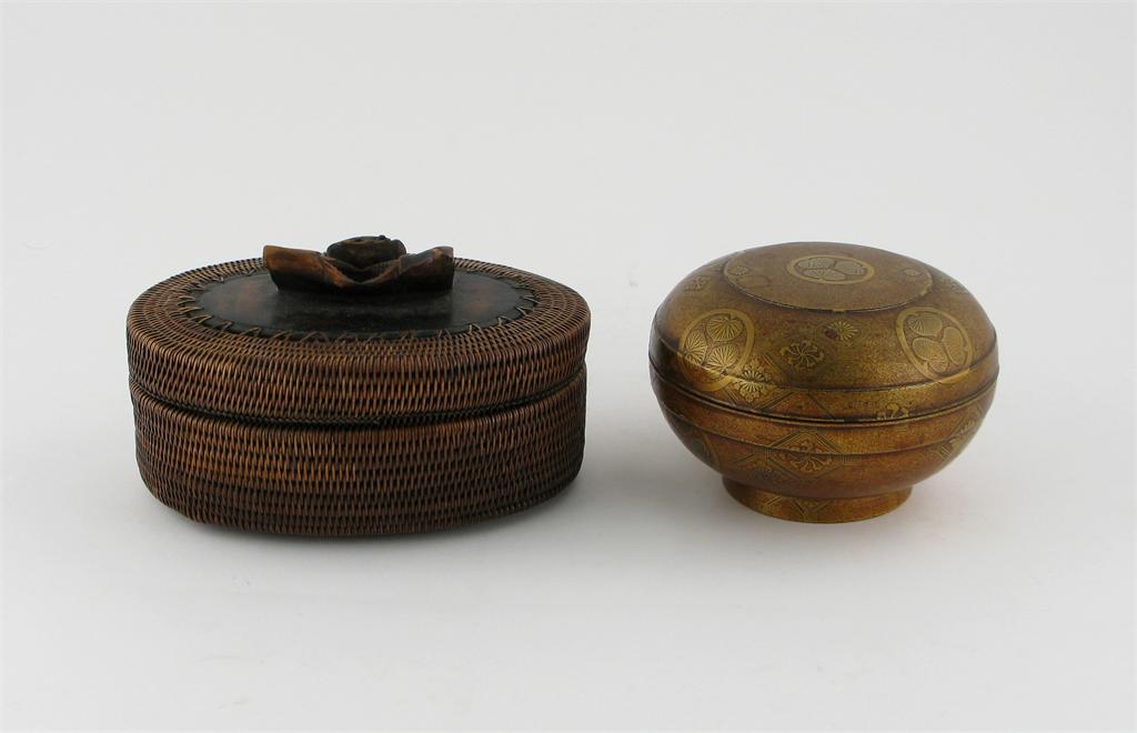 A Japanese gold lacquer circular box and cover, decorated with paulownia mon, and an oval wicker basket with a carved crab finial, 19th/20th century, 17cm max. (4)