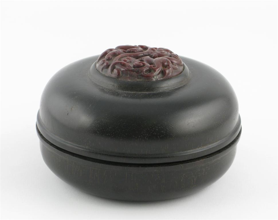 A Chinese hardwood box and cover, thickly turned, the red agate finial carved as a bifid dragon capturing a bird, 19th/20th century, 12.2cm. (2)
