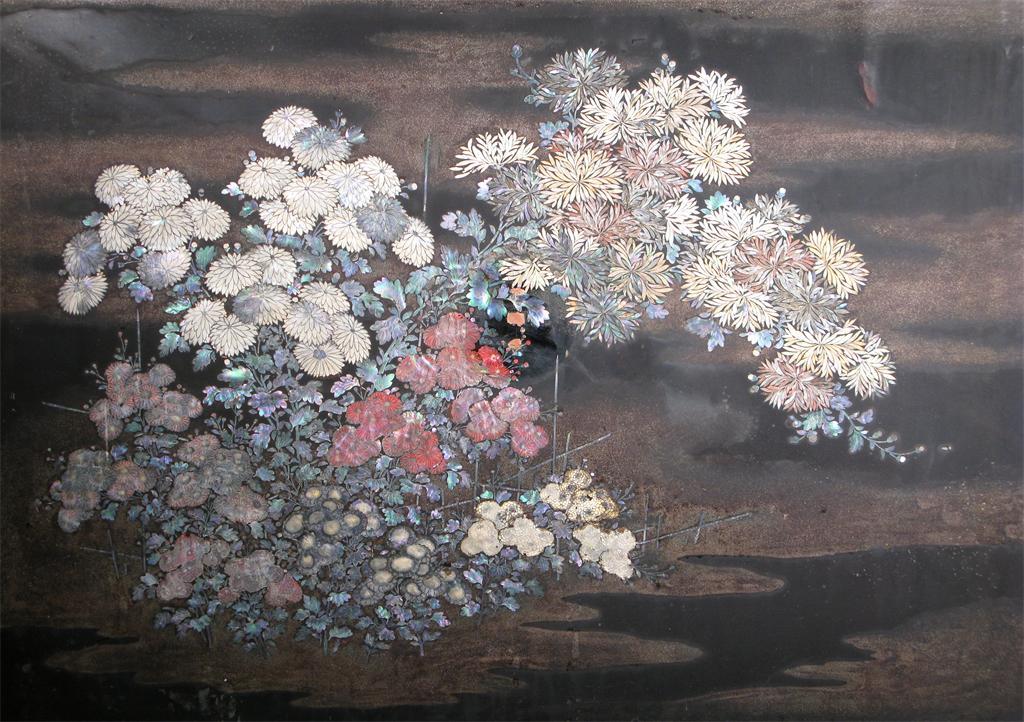 A large Japanese black lacquer panel, decorated in mother of pearl with chrysanthemum, 19th century, damages, 76.5cm x 104cm.