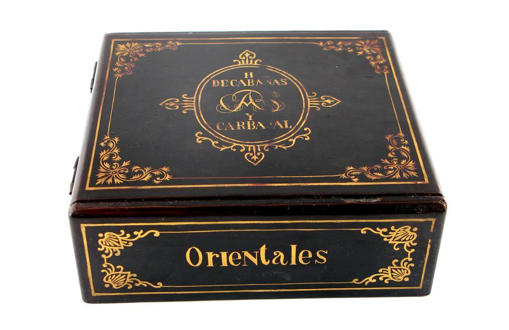 A black lacquered armorial cigar box, decorated in gold and inscribed 'H Decabanas y Carbajal', 'Orientales' and 'Flor Fina' to the sides, the interior with an elaborate coat of arms, 19th century, 18.5cm.