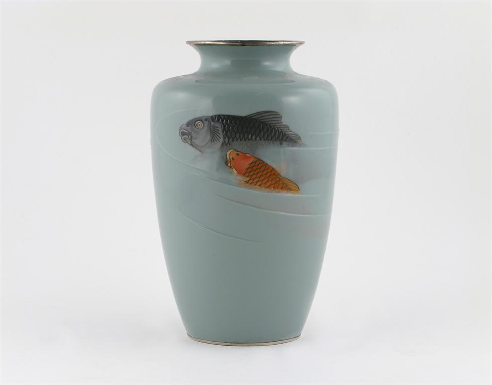 A Japanese musen enamel vase, decorated with carp rising from cloudy waters, unmarked, the rim and foot with silver-plated mounts, Meiji 1868-1912, 24cm.