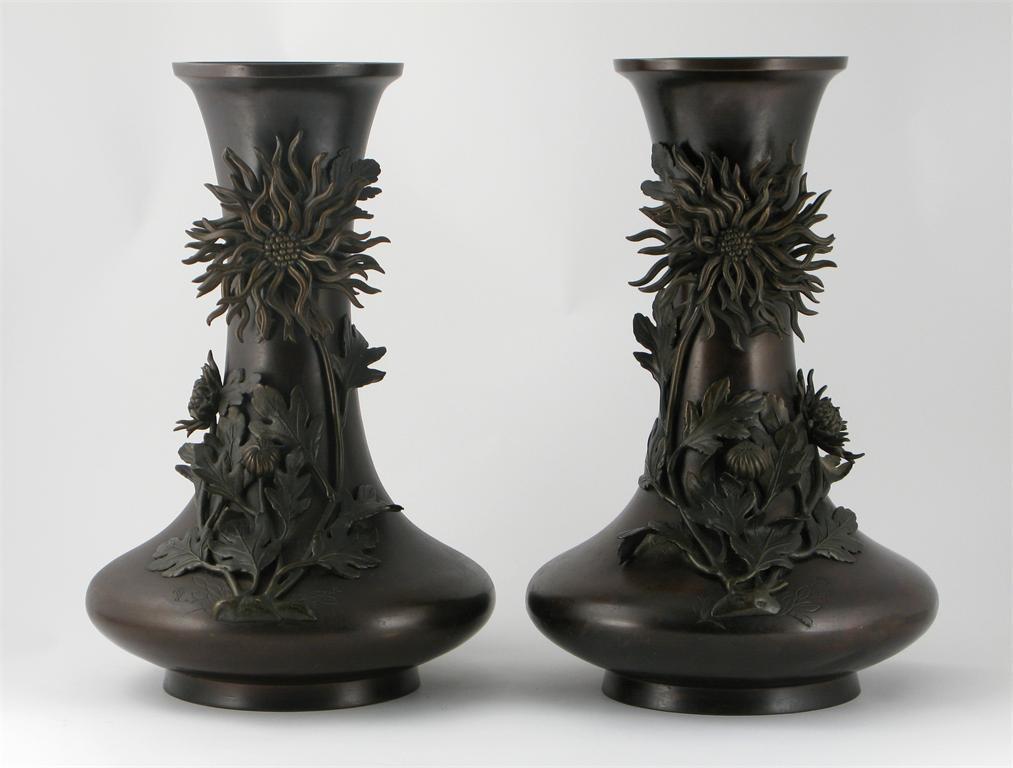 A pair of Japanese bronze vases, applied in relief with large chrysanthemum sprays, the bases with paulownia mons, c.1900, dents, 40cm. (2)
