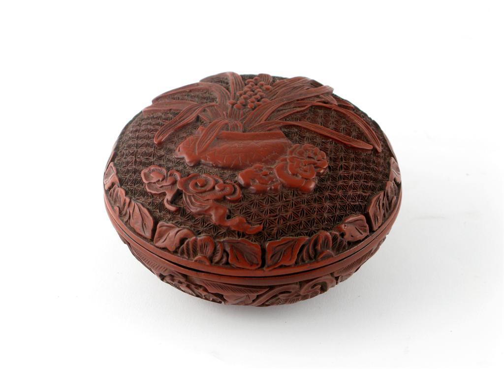 **A Chinese red lacquer circular box and cover, decorated with a vase of orchids and bands of stylized flowers, probably 18th century, 10cm. (2)