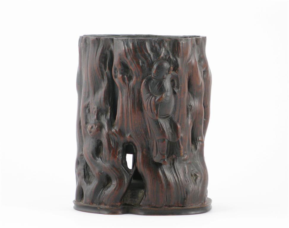 A Chinese root-wood brushpot, reticulated and applied with a carved figure to the side and with a fitted metal liner, probably 18th century and later, old damages, 14cm.