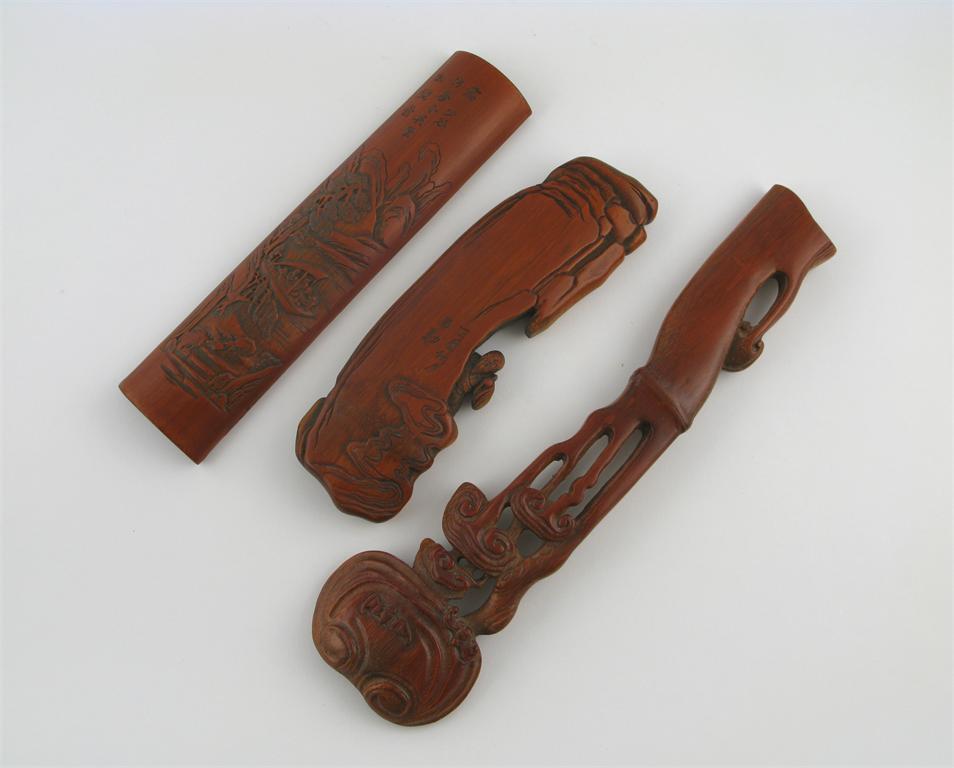 Three Chinese bamboo wrist rests, one carved as a ruyi sceptre, one carved with a figure in a rocky landscape, the third carved with figures in boats, one inscribed with the date, 9th month ding you year (1837/1897), 29.5cm. (3)