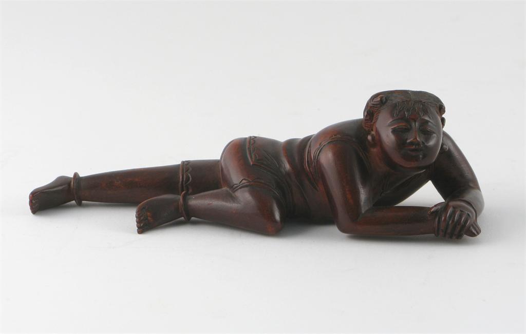 **A Chinese hardwood carving of a boy reclining on his front