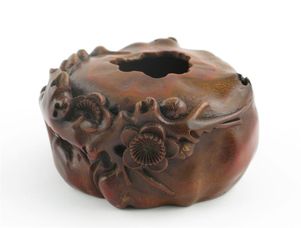 A Chinese bamboo brushwasher, carved with prunus blossom, 10cm.