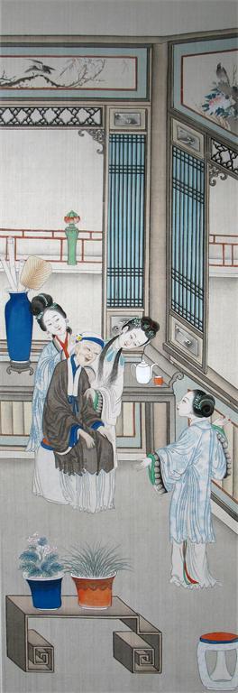 A set of four Chinese paintings on silk, of beautiful young ladies in interiors engaged in domestic pursuits, c.1900, 74cm. Framed and glazed. (4)