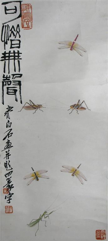 A Chinese scroll painting, depicting dragonflies, two crickets and a praying mantis, inscribed 'Qi Bai Shi' and with a studio seal, 76.5cm x 34cm.