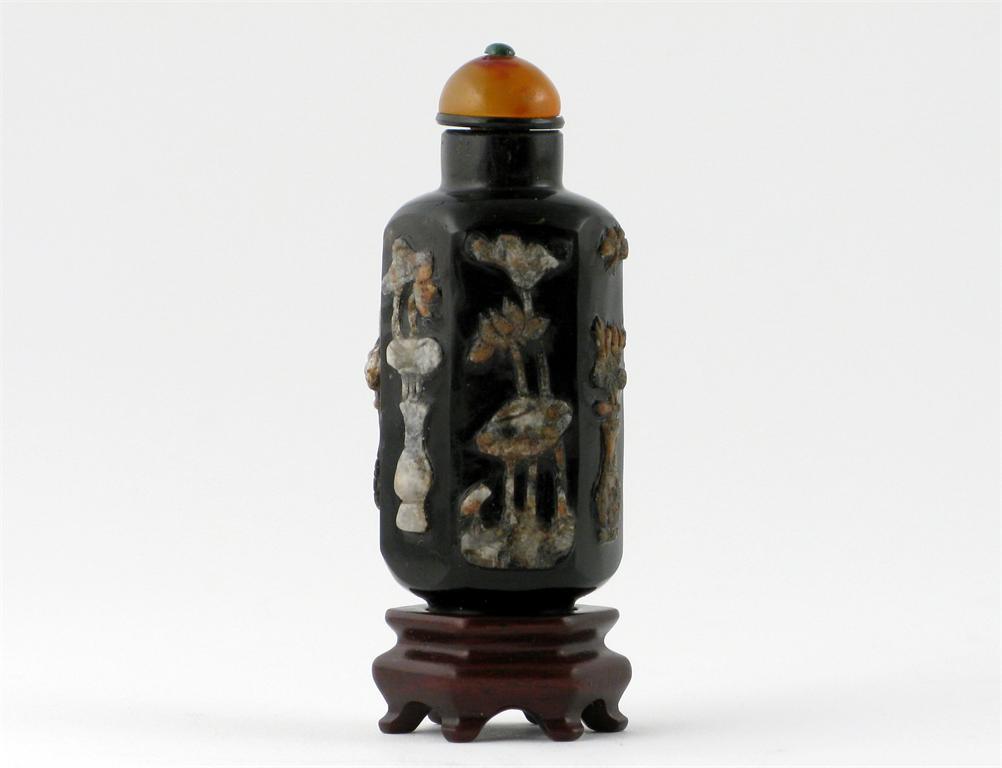 A Chinese black quartz hexagonal section snuff bottle, stopper and stand, the paler impurities carved in relief with aquatic plants and vases of flowers, 19th century, 6cm.