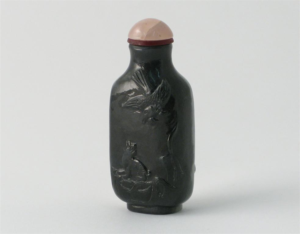 A Chinese black and white jade snuff bottle, one side carved with a cat looking up at a flying bird, the reverse with a butterfly above an orchid, c.1900, 7.5cm.