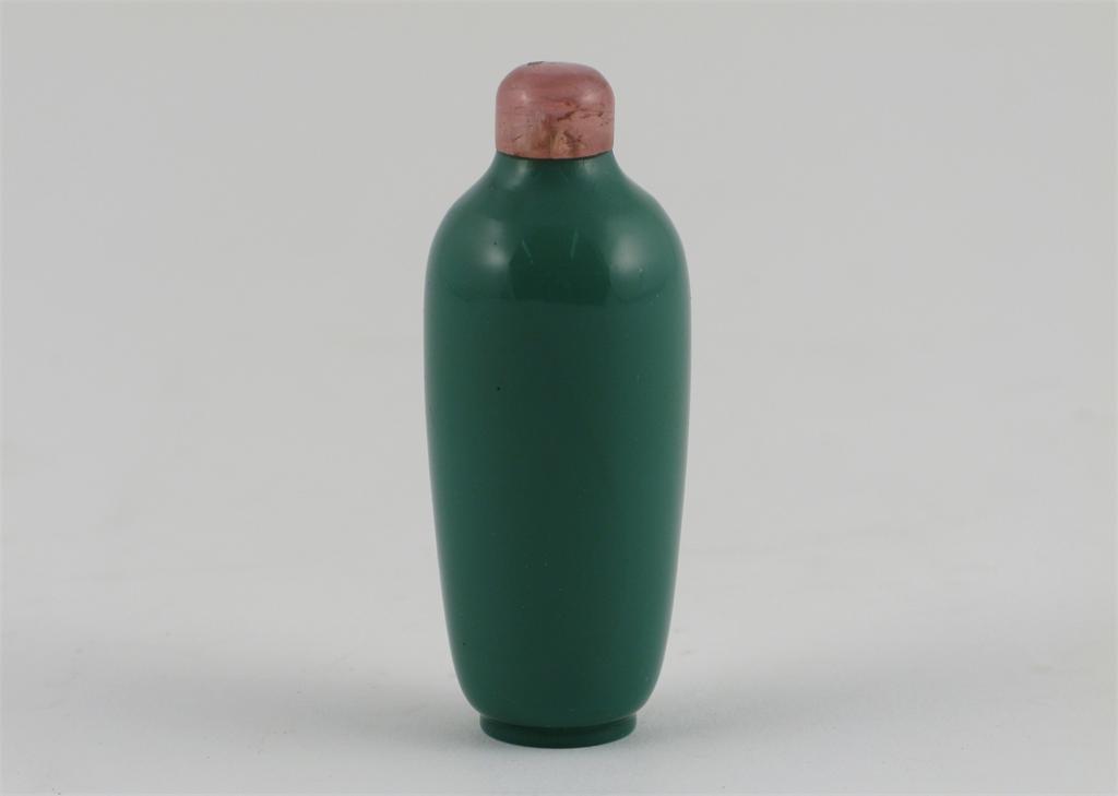 A Chinese green glass snuff bottle, with cylindrical body and rose quartz stopper, 6.2cm.
