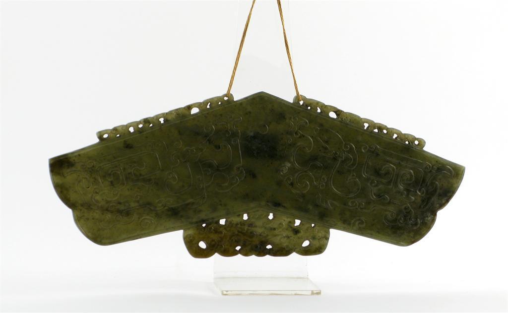 A Chinese spinach jade sonorous stone bianqing, each side carved in shallow relief with tao tie designs, probably 20th century, 26cm.