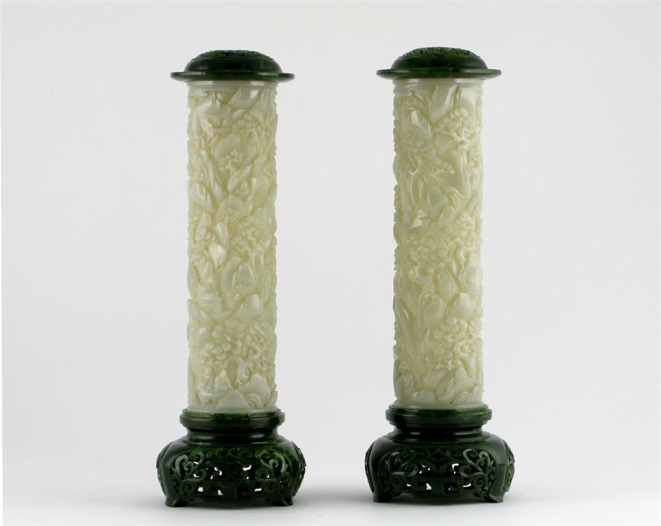 **A fine pair of Chinese pale celadon jade cylindrical incense burners