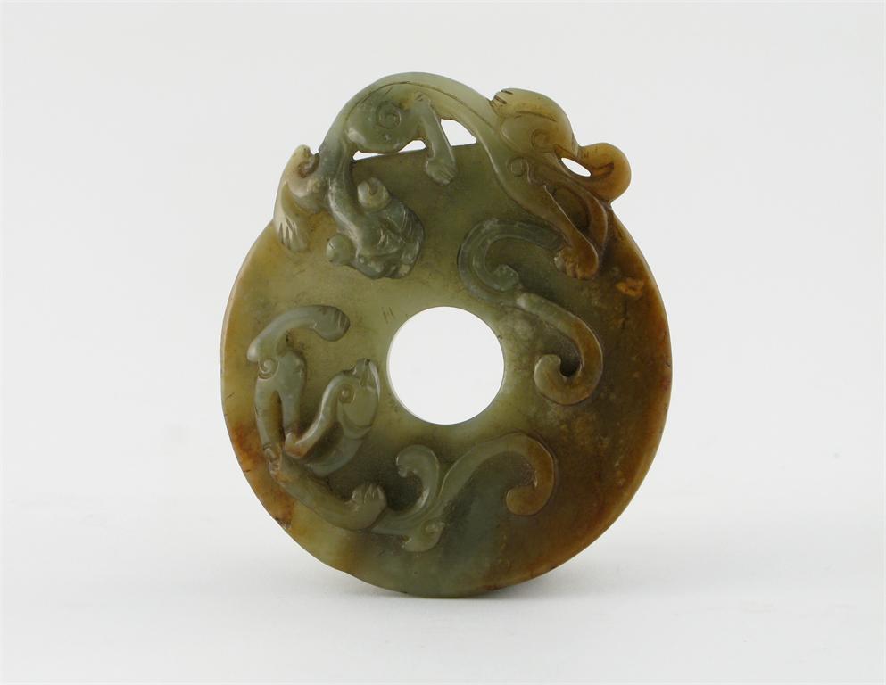 A Chinese jade bi disc, carved in relief with two mythical creatures, 17th century, 9cm.