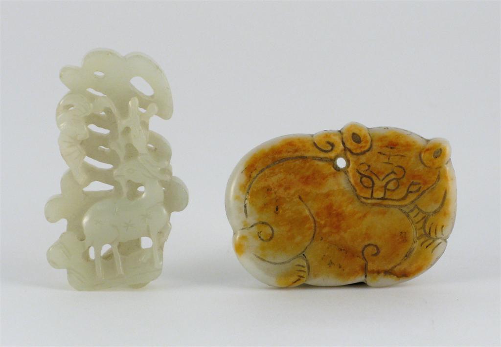 A Chinese jade pendant, carved in high relief with deer and a bat on a Chinese character, and a second jade pendant carved with an archaic kylin and a russet cat, 18th/19th century, 6cm. (2)