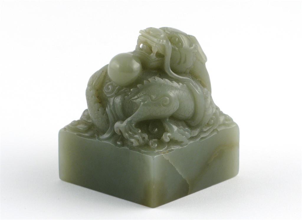 A Chinese jade square seal, carved as a dragon curled up around a pearl, above scrolling clouds, 6cm.