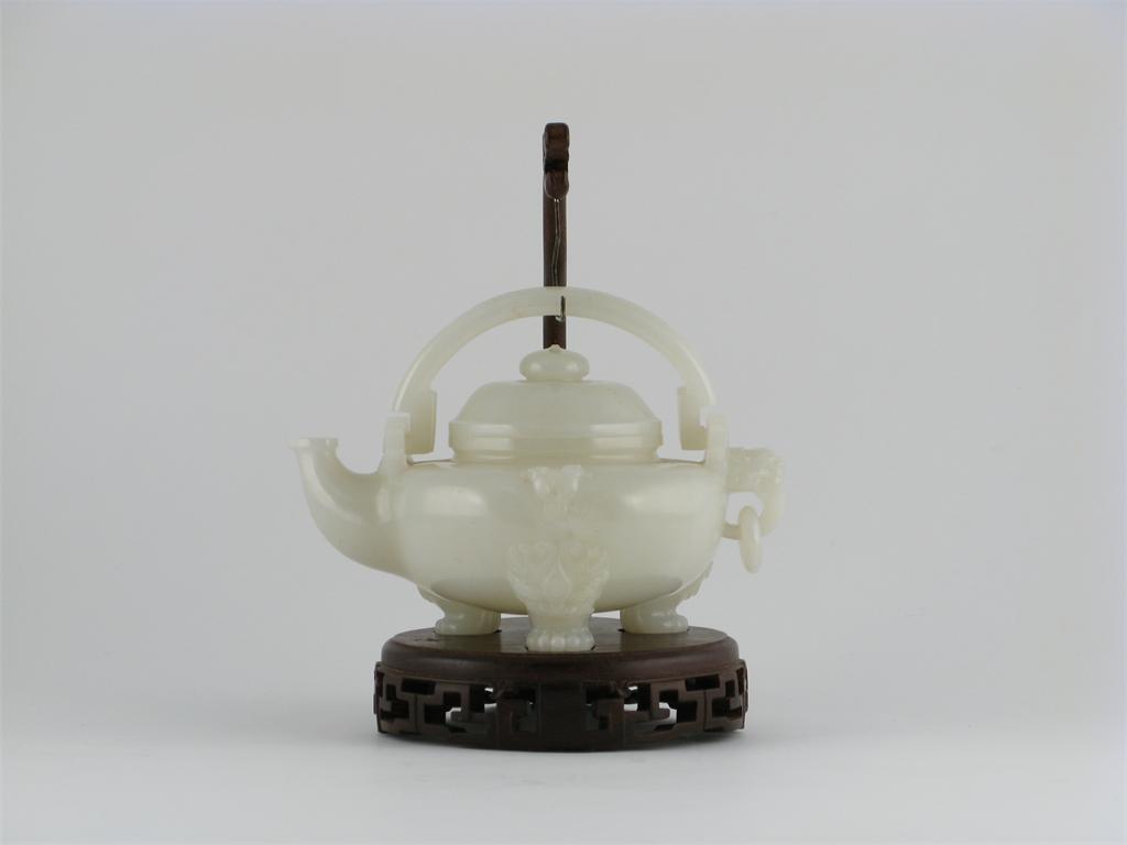 **A large Chinese white jade pouring vessel, with a double-hinged handle, and a single loose suspension ring, the shoulders carved with two horned goats heads, the three paw feet capped with lion dog masks, probably 19th century, 20.5cm, and a wood stand. (3)