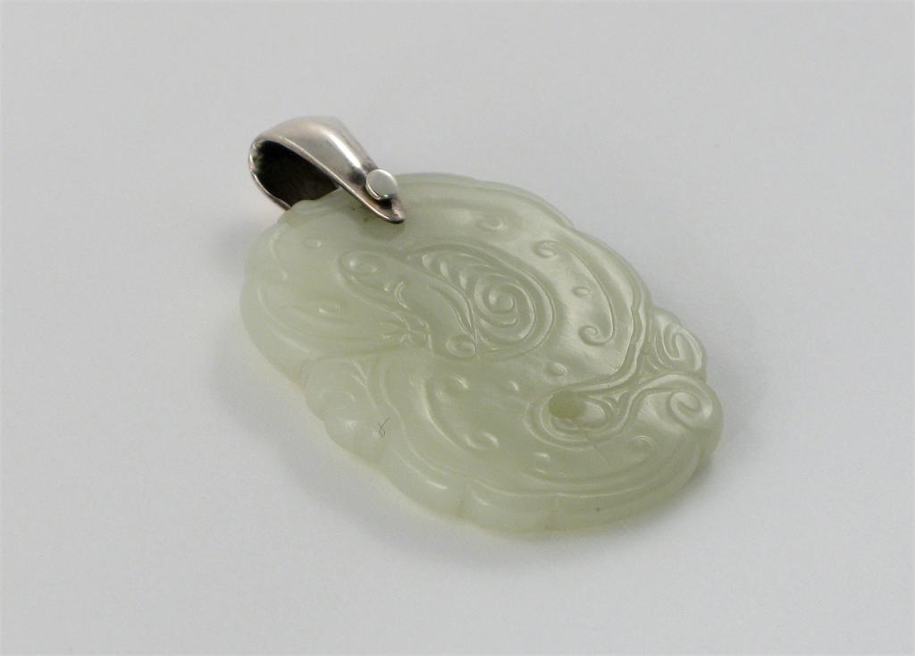 A Chinese white jade pendent, carved on each side with an archaic chilong dragon, 18th/19th century, 4.7cm.