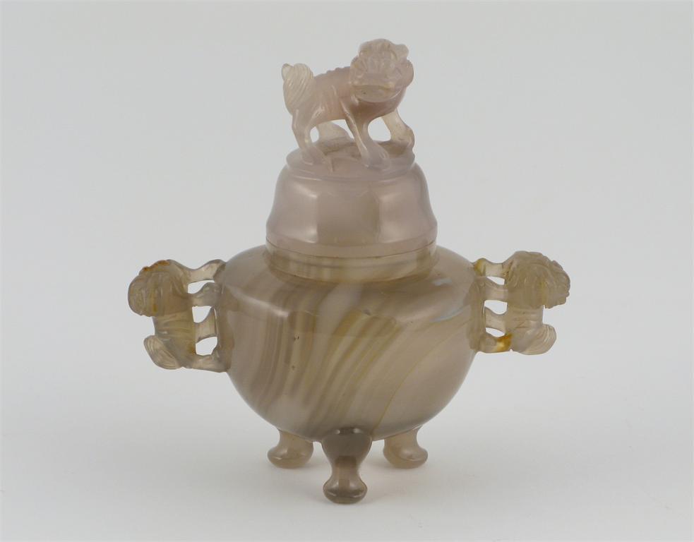 A Chinese agate tripod censer and cover, carved with lion dogs, 19th century, 12cm.