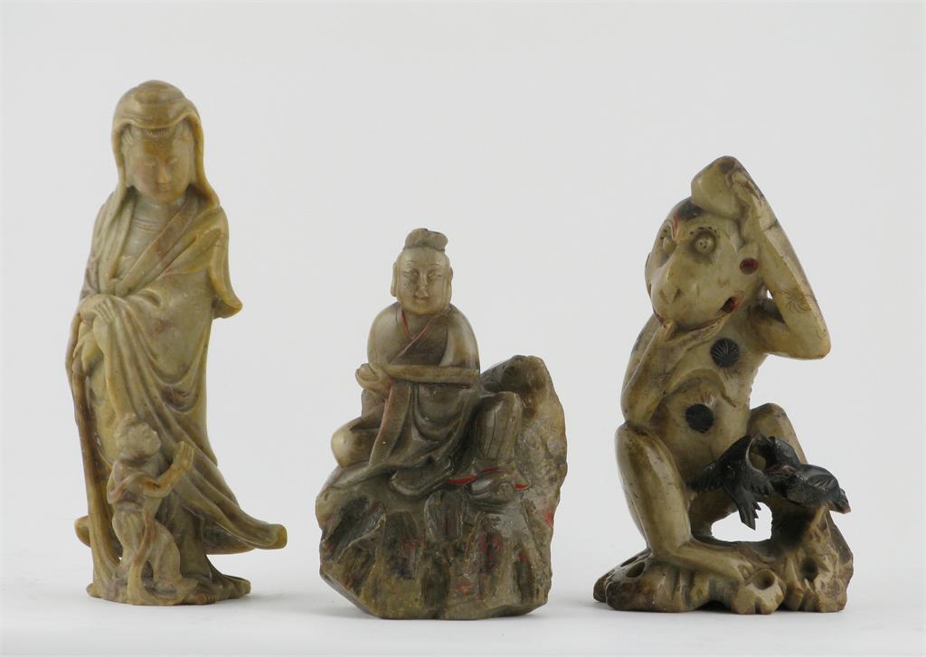 A Chinese soapstone carving of Guanyin, pouring out water from a vessel, and two other Chinese soapstone carvings of a monkey and a figure seated upon rocks, 19th/20th century, 17cm max. (3)