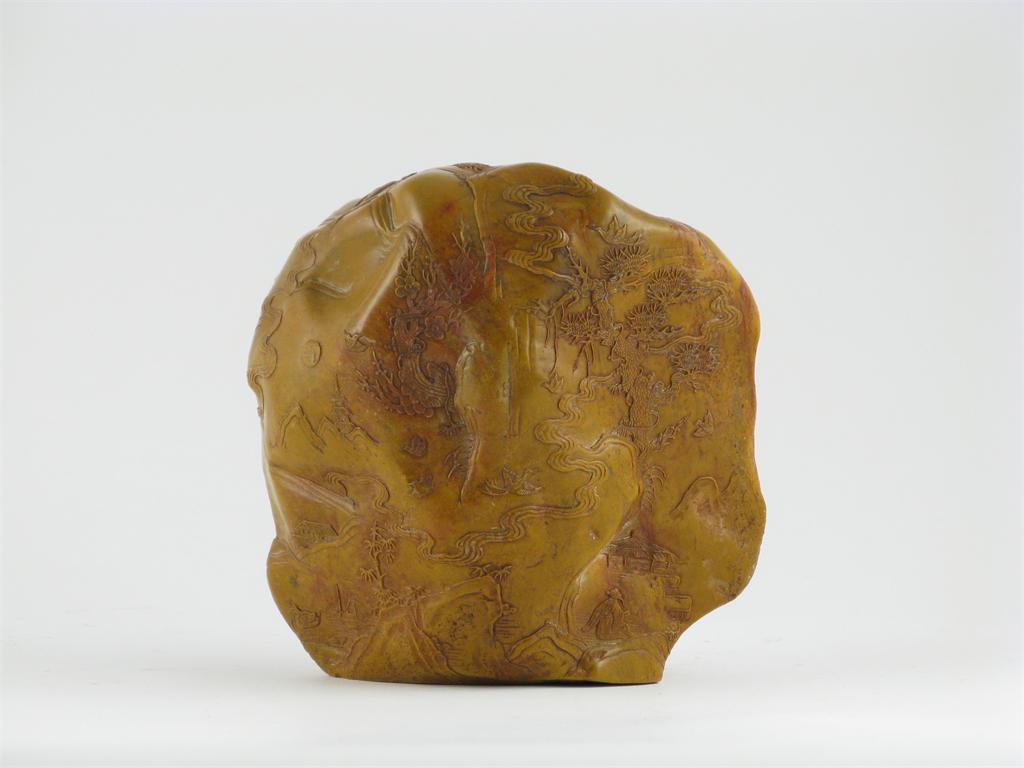 A large Chinese soapstone seal, formed as a boulder, carved in detail around the stone's natural shape, with two figures, huts, gnarled trees growing off cliff faces, many birds in flight and a long and swirling cloud of smoke, 19th century, 14.5cm.