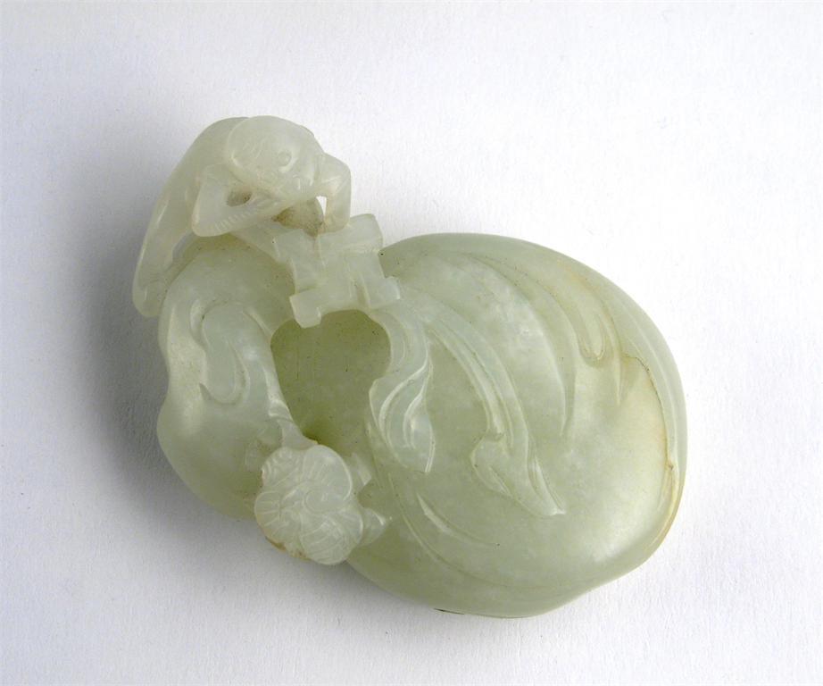 A Chinese pale celadon carving of a monkey, holding a swastika and scrambling over a large bag tied up with a ribbon, as a symbol meaning: 'May every generation be given the title of marquis', a bee lies nearby, 18th century, 6.5cm.
