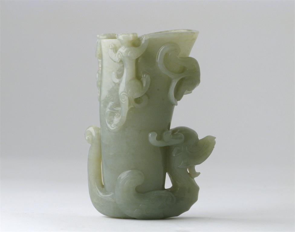 **A Chinese celadon-coloured jade rhyton cup, the body rising from the back of a fabulous beast, while three chilong dragons clamber around the rim, probably 17th century, 10cm.
