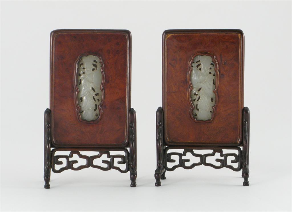 A miniature pair of Chinese table screens, each formed as a pierced jade plaque of a standing lady holding a vase, mounted in a burr wood panel, 19th century, 12.5cm. Each on a wooden stand. (4)