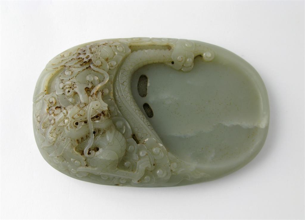 **A Chinese jade ink stone, with a dragon writhing down the side over billowy clouds, 13cm.