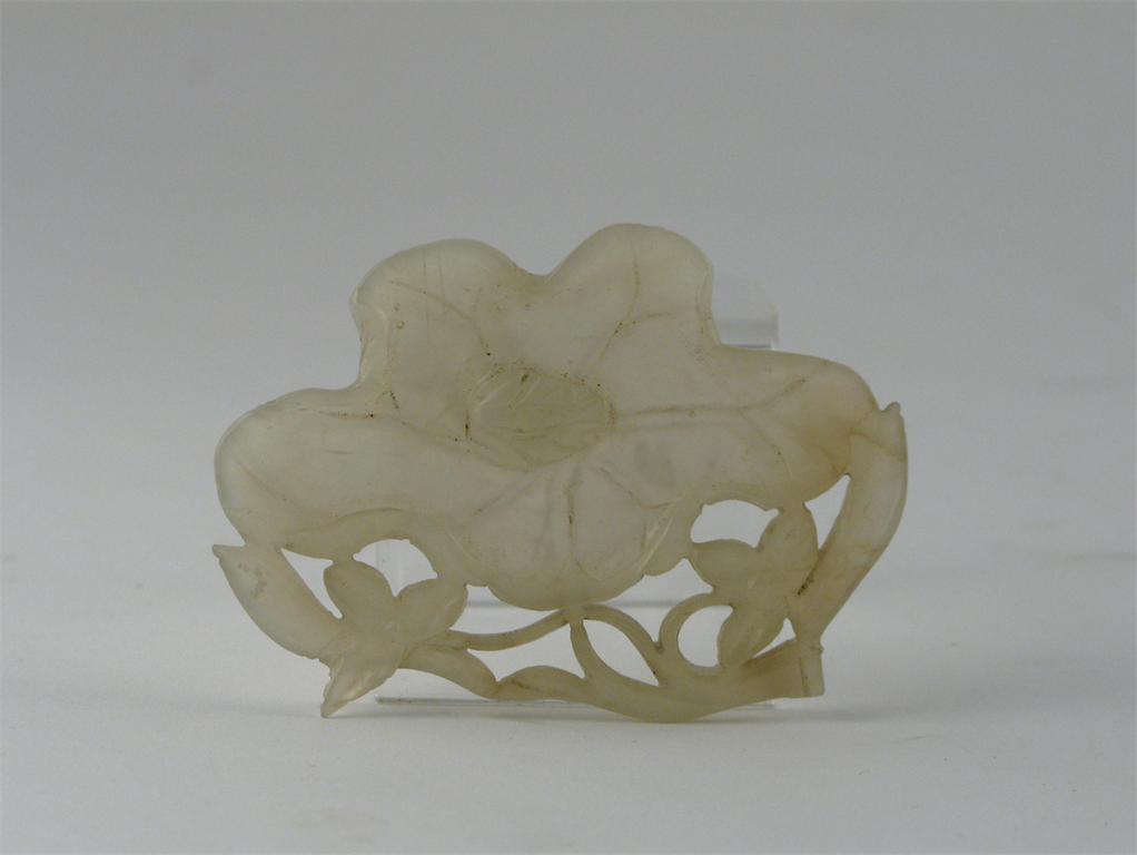 **A small white jade dish, formed as a lotus leaf upon which a small frog crouches, 6.5xm.